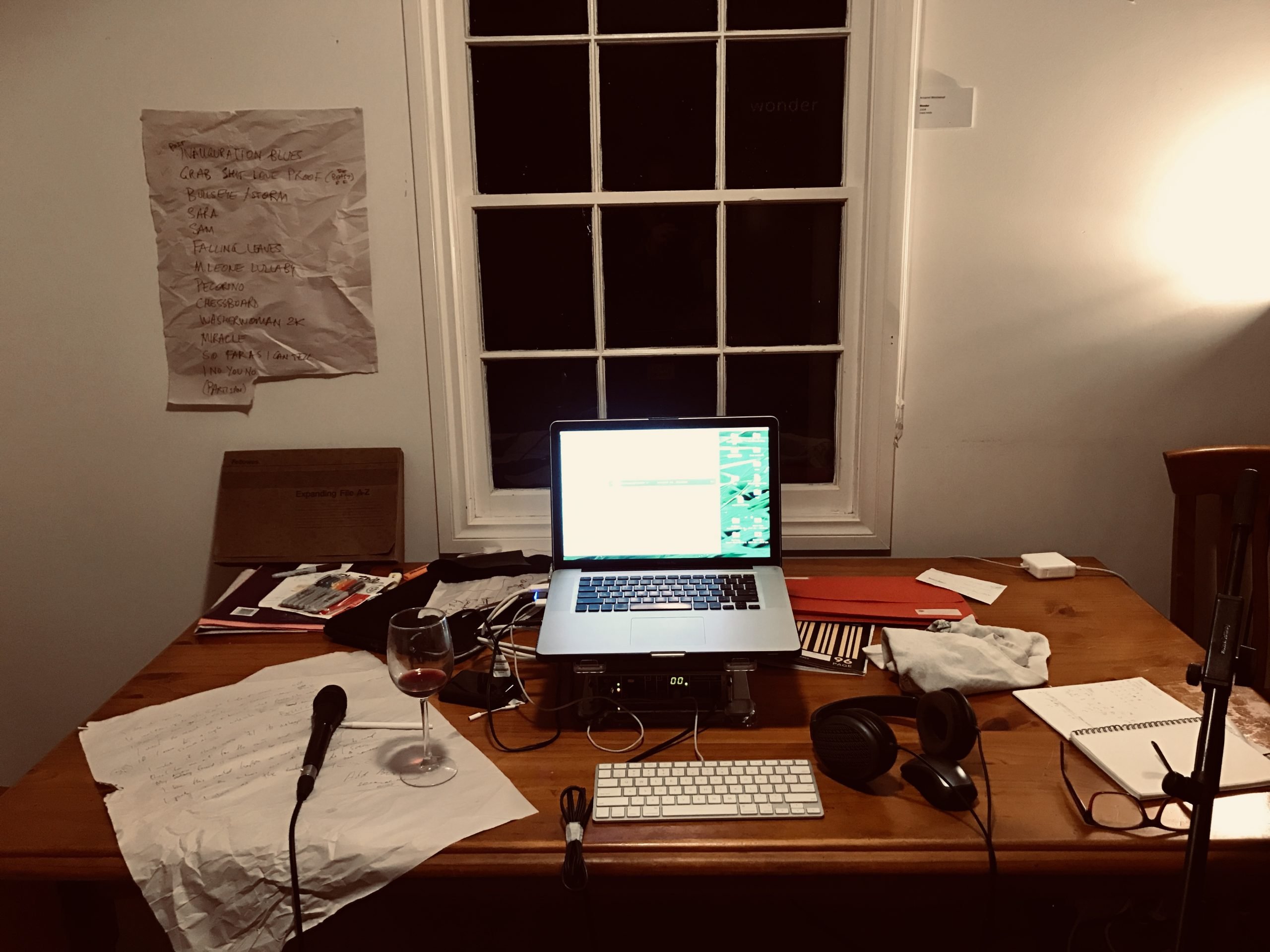 The only equipment I brought this time, in addition to my laptop and some butcher’s paper, was a handheld mic, a classical guitar and a borrowed mandolin. Recording a song into multi-track recording software for the first time is always a life-changing moment for that song. This thing that has lived only through your head and hands and voice is now suddenly and completely open for a journey of finding itself. It’s like meeting someone truly for the first time, and seeing what they’re made of, and how they transform in shape, texture and meaning when you add appendages and organs and breath.