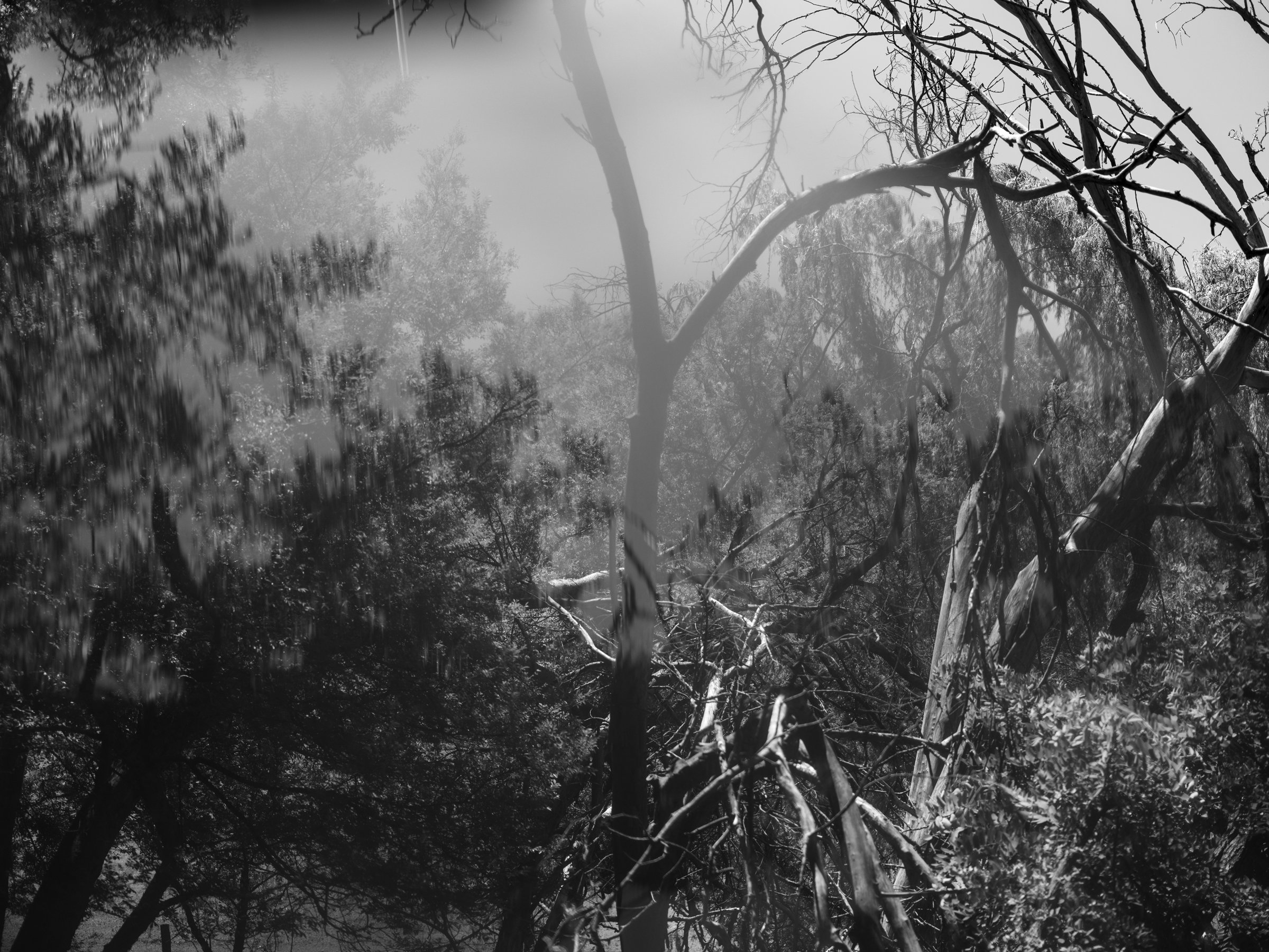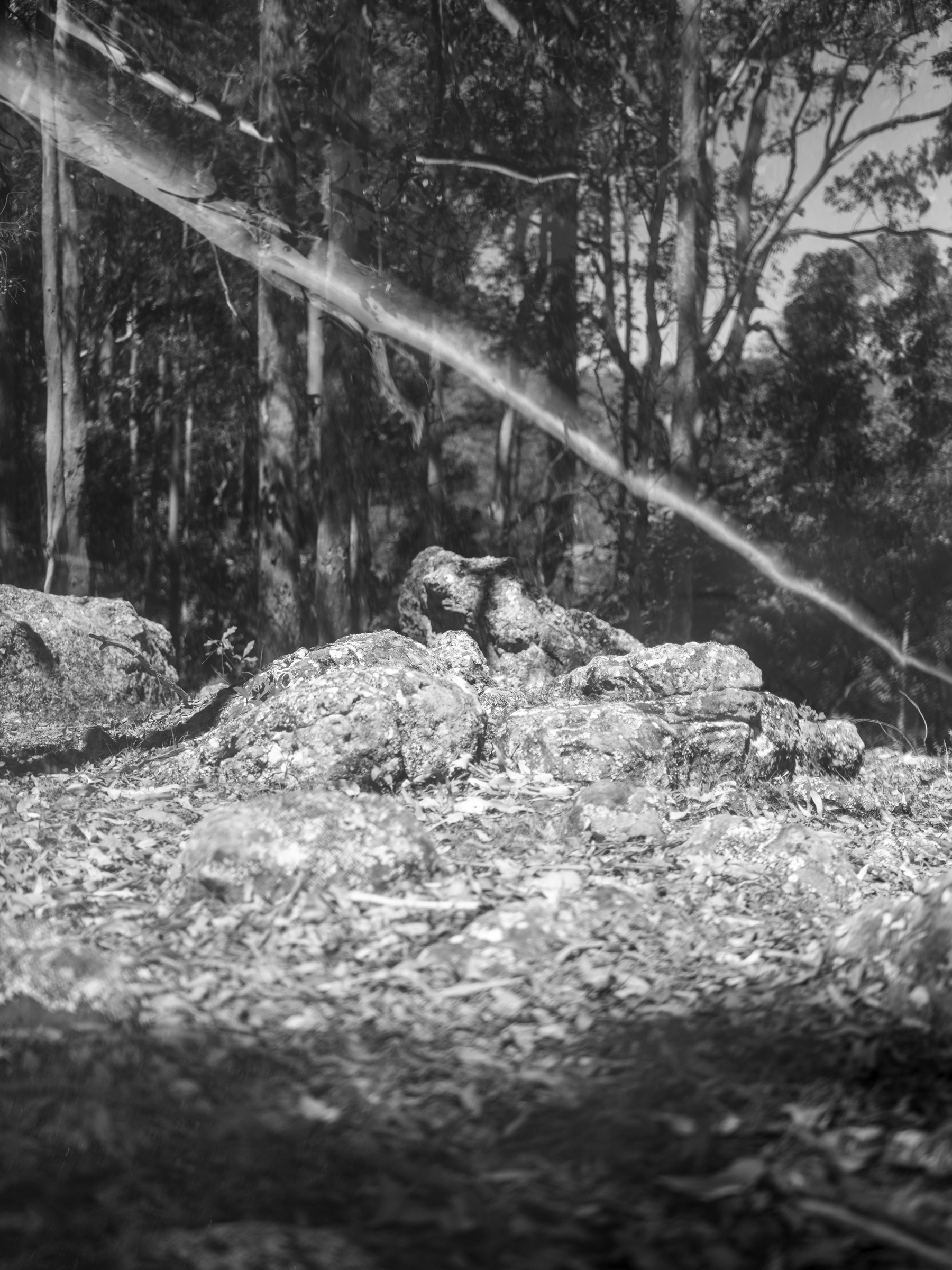 During my time at the Bundanon residency, I worked with this dust as a material and experimented with ways of embedding the dust directly into photographic processes. This included coating the camera lens, pre exposing film, and constructing landscapes. Using the dust as a filter subtly distorted the landscape before the camera, giving the images a otherworldly quality. The dust was once again filtering the light, subtly altering the viewers perception of the bush and the landscape surrounding Bundanon. What began as a simple gesture — allowing dust to mediate a photographic encounter — became a means of connecting with the past and present. These images are hard to pin down; they subvert traditional landscape conventions through their blurry configuration, bringing a sense of mystery and sensuousness. Other images were made by using a handheld scanner to capture the surfaces of tree trunks. These slices became landscapes in themselves, creating a sense of vastness and wonder within the more-than-human realm.