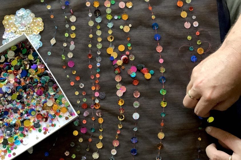 Choose thread, sequins and beads from discarded garments, and stitch your abstract line while reflecting on a personal memory or experience. See the stitched gestures accumulate across the festival weekend, creating a map of collective experiences as a single tapestry. This drop-in session invites participants to arrive and leave at their own pace.